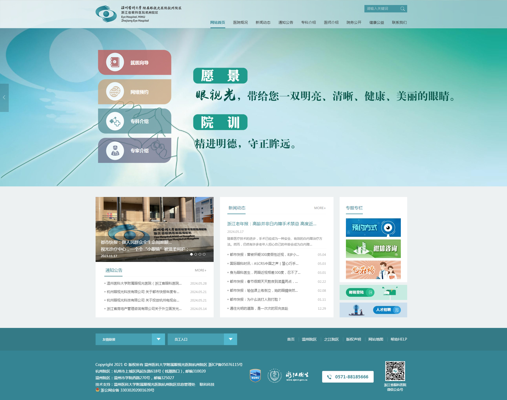 溫州醫(yī)科大學(xué)附屬眼視光醫(yī)院成立于1998年,2009年經(jīng)省衛(wèi)生廳批準(zhǔn)增掛“浙江省眼科醫(yī)院”,2010年開設(shè)杭州院區(qū),是浙江省首家三級(jí)甲等眼科??漆t(yī)院。醫(yī)院承擔(dān)臨床醫(yī)療、醫(yī)學(xué)教育、醫(yī)學(xué)科研、預(yù)防保健等任務(wù),是國家眼部疾病臨床醫(yī)學(xué)研究中心、眼視光學(xué)和視覺科學(xué)國家重點(diǎn)實(shí)驗(yàn)室、國家眼視光工程技術(shù)研究中心、國家藥監(jiān)局眼科疾病醫(yī)療器械和藥物臨床研究與評(píng)價(jià)重點(diǎn)實(shí)驗(yàn)室,以及國家眼科學(xué)臨床重點(diǎn)???、教育部近視防控與診治工程研究中心。