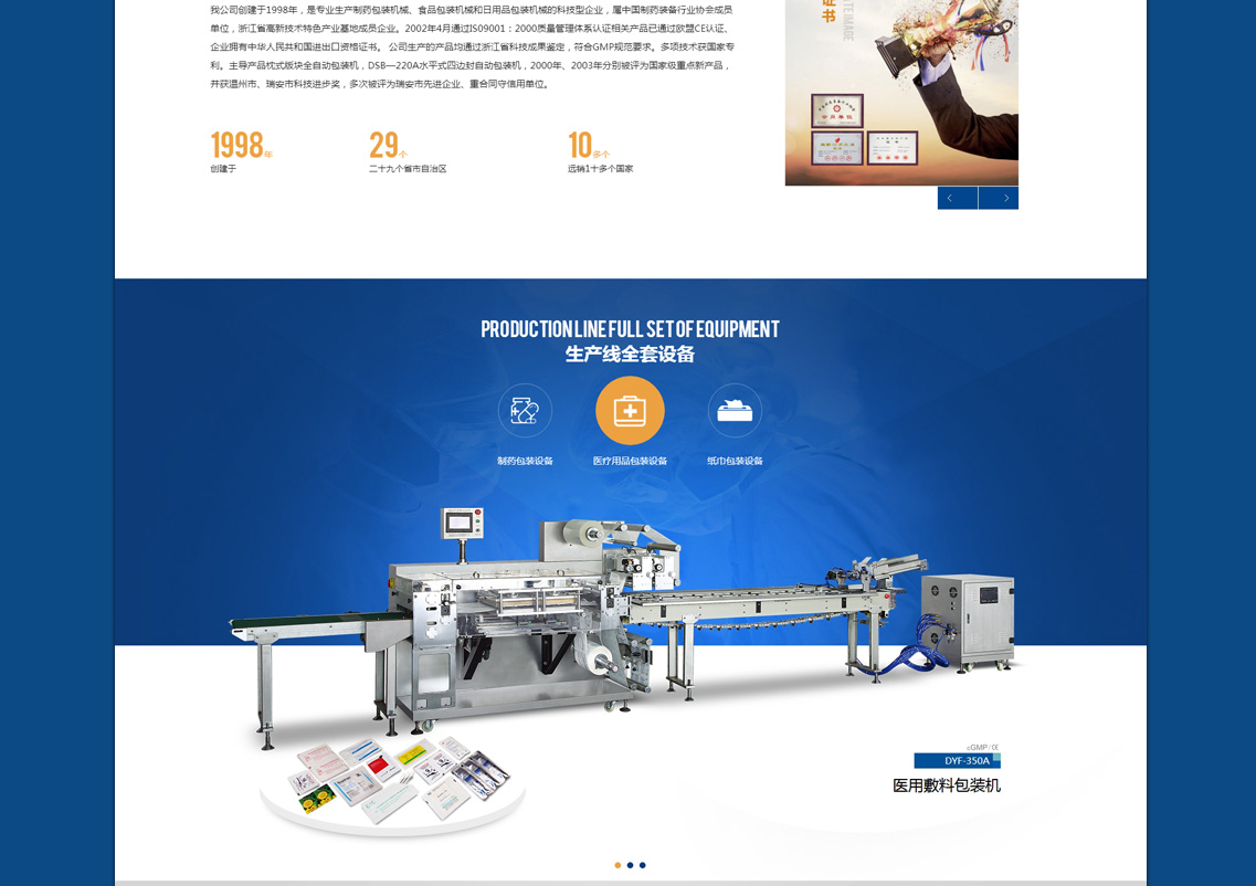 我公司創(chuàng)建于1998年,是專業(yè)生產(chǎn)制藥包裝機(jī)械、食品包裝機(jī)械和日用品包裝機(jī)械的科技型企業(yè),屬中國制藥裝備行業(yè)協(xié)會成員單位,浙江省高新技術(shù)特色產(chǎn)業(yè)基地成員企業(yè)。2002年4月通過IS09001:2000質(zhì)量管理體系認(rèn)證相關(guān)產(chǎn)品已通過歐盟CE認(rèn)證、企業(yè)擁有中華人民共和國進(jìn)出口資格證書。