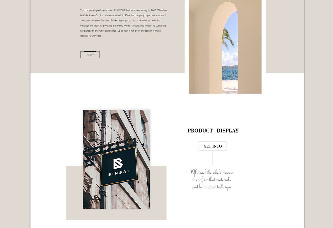 he company's predecessor was ZHONGHE leather shoes factory. In 2000, Wenzhou BINSAI Shoes Co., Ltd. was established. In 2009, the company began t