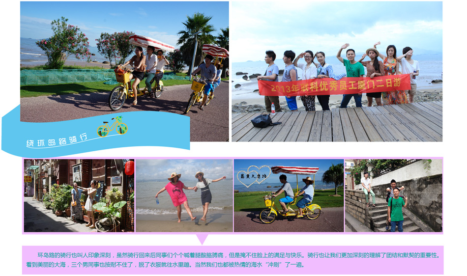 2013年6月22日,為了給員工創(chuàng)造一個(gè)放松機(jī)會(huì),我公司后勤部全體工作人員和部分技術(shù)部工作人員前往世界聞名的"海上花園"城市廈門(mén)體驗(yàn)夏季休閑之旅。本次旅游活動(dòng)主要有以下幾個(gè)環(huán)節(jié),它們分別是品嘗廈門(mén)特色小吃,繞環(huán)島路騎行,體驗(yàn)海風(fēng)及海水的清涼,乘坐輪渡享受海風(fēng),欣賞鼓浪嶼的百?lài)?guó)建筑群,品味廈門(mén)休閑生活的節(jié)奏。22日中午,我們抵達(dá)廈門(mén),按照原本的計(jì)劃逐一體驗(yàn)。