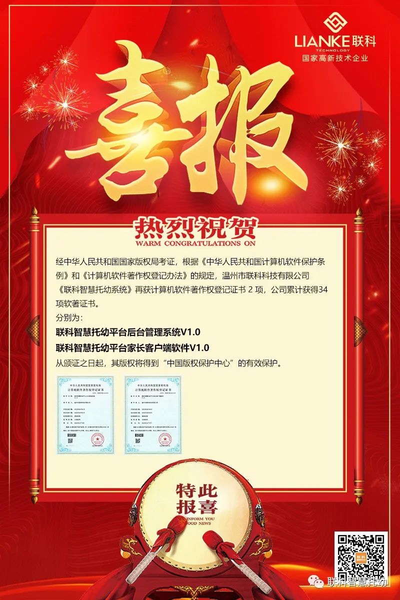 【喜報(bào)】熱烈祝賀我司《聯(lián)科智慧托幼系統(tǒng)》榮獲多項(xiàng)計(jì)算機(jī)軟件著作權(quán)