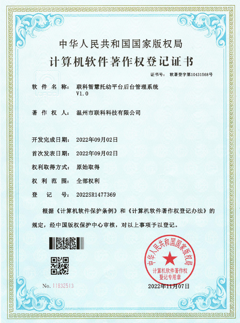 《聯(lián)科智慧托幼平臺(tái)后臺(tái)管理系統(tǒng)V1.0》于2022年11月07日被正式授予《中華人民共和國(guó)國(guó)家版權(quán)局計(jì)算機(jī)軟件著作權(quán)登記證書》,登記號(hào)為2020SR1477369。