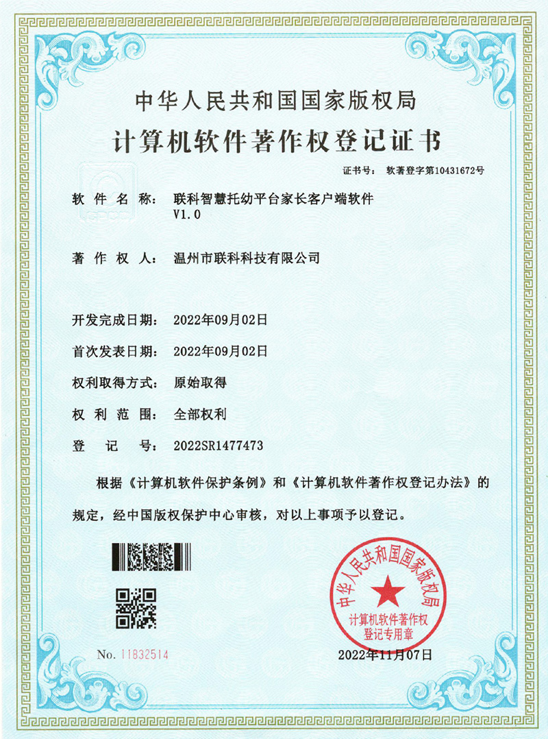 《聯(lián)科智慧托幼平臺(tái)家長(zhǎng)客戶端軟件V1.0》于2022年11月07日被正式授予《中華人民共和國(guó)國(guó)家版權(quán)局計(jì)算機(jī)軟件著作權(quán)登記證書》,登記號(hào)為2020SR1477473。