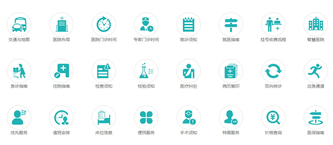 就醫(yī)向導板塊,下方相連一張高清大圖,聯(lián)接醫(yī)院布局、交通與地圖、門診時間等等24個便利快捷入口。