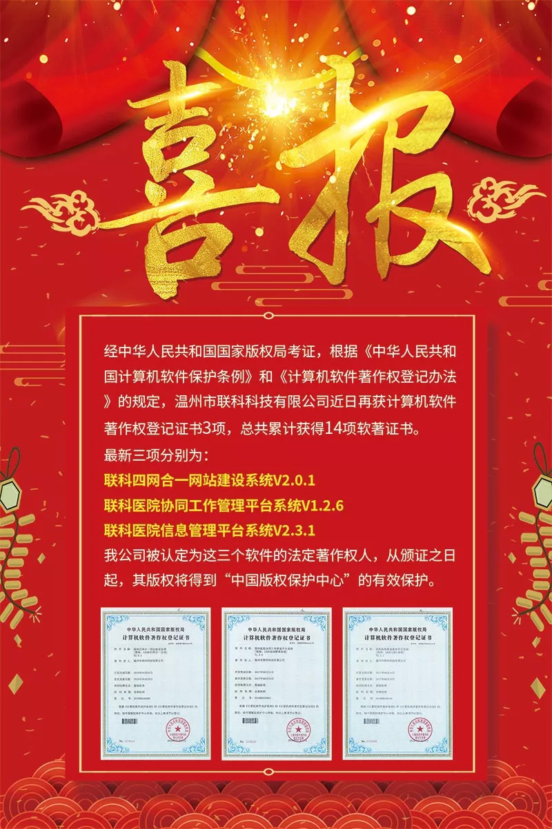 經(jīng)中華人民共和國(guó)國(guó)家版權(quán)局考證,根據(jù)《中華人民共和國(guó)計(jì)算機(jī)軟件保護(hù)條例》和《計(jì)算機(jī)軟件著作權(quán)登記辦法》的規(guī)定,溫州市聯(lián)科科技有限公司近日取得計(jì)算機(jī)軟件著作權(quán)登記證書(shū)3項(xiàng)。