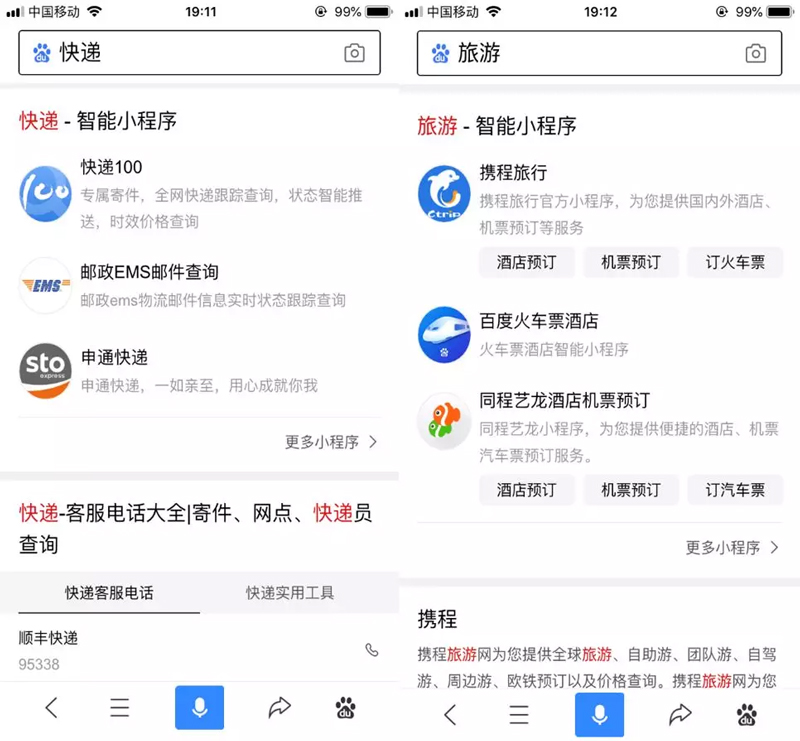 泛詞聚合卡片示例:當用戶搜索“快遞”時,搜索結果中會匹配出“快遞100、郵政EMS郵件查詢”等3個相關智能小程序。點擊下方的“更多小程序”,可以查看與“快遞”或“旅游“相關的全部智能小程序。