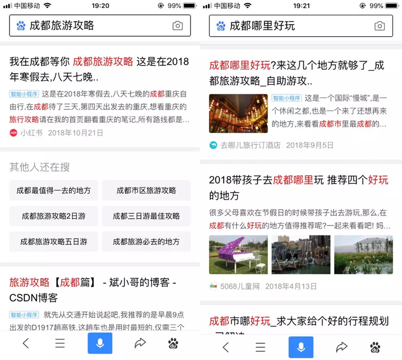 長尾詞搜索示例:用戶搜索“成都旅游攻略”“成都哪里好玩”等關鍵詞,小紅書和去哪兒旅行的相關內容都會以智能小程序的方式出現,并會通過醒目的“智能小程序”標記提醒用戶。