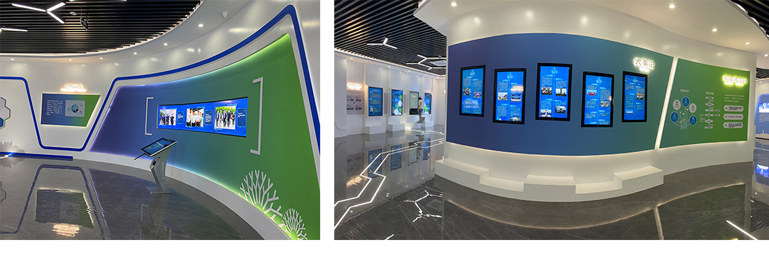 在總體設(shè)計(jì)樣式上,引入了大量富含科技感的線條、配色以及動(dòng)畫效果。充分考慮到展廳設(shè)備的人機(jī)工程交互的獨(dú)特性,針對(duì)每一臺(tái)設(shè)備和屏幕進(jìn)行定制化的設(shè)計(jì)與后期調(diào)試,使整體展館具有更好的視覺效果。