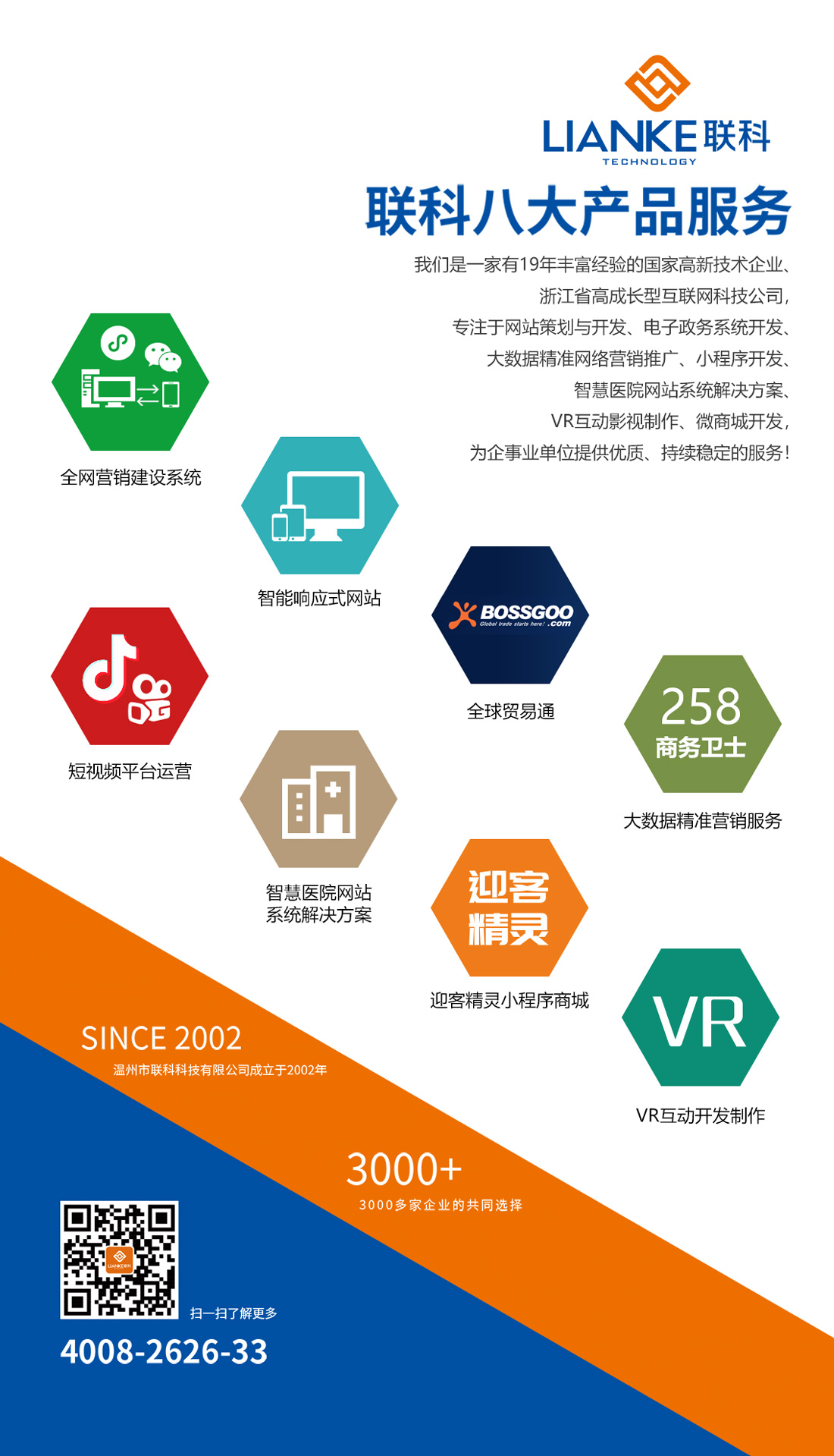 溫州市聯(lián)科科技有限公司成立于2002年,3000多家企業(yè)的共同選擇,致力于為中國(guó)的成長(zhǎng)型企業(yè)提供電子商務(wù)整體解決方案。從網(wǎng)站建設(shè)開發(fā)、微信小程序開發(fā)、網(wǎng)絡(luò)購(gòu)物商城系統(tǒng)開發(fā)、智慧醫(yī)院網(wǎng)站系統(tǒng)解決方案、移動(dòng)電商連鎖開店平臺(tái)開發(fā)到網(wǎng)絡(luò)營(yíng)銷整合服務(wù),始終圍繞企業(yè)發(fā)展過程中對(duì)銷售力提升的需求,進(jìn)行持續(xù)的服務(wù)創(chuàng)新和產(chǎn)品研發(fā)。