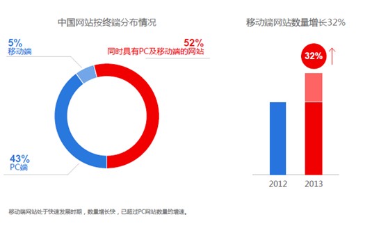 在這份報(bào)告中,我們不難看出PC與移動(dòng)的同步發(fā)展是未來的一大趨勢,就拿2012年與2013年的移動(dòng)端網(wǎng)站的情況對比,2013年的移動(dòng)端網(wǎng)站數(shù)量增加了32%,而這一數(shù)據(jù)還保持著快速增長的發(fā)展趨勢。