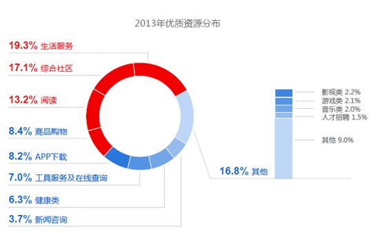 雖然,移動(dòng)端網(wǎng)站、移動(dòng)端服務(wù)沒有完善的服務(wù)體系,尚處于發(fā)展的上坡路之中,仍舊有一些企業(yè)能夠做出一些優(yōu)質(zhì)的移動(dòng)端資源,而這些優(yōu)質(zhì)資源主要是集中在生活服務(wù)類、綜合社區(qū)類、閱讀、商品購物、APP下載,不僅占比最高而且增速明顯,如圖中的數(shù)據(jù)顯示可以看出。