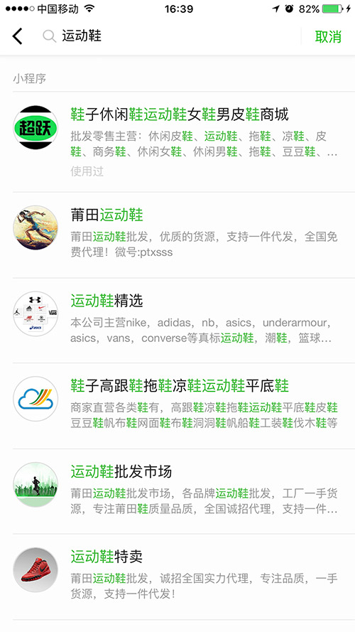 比如上面的圖片中,小程序中搜索關(guān)鍵詞“運(yùn)動(dòng)鞋”,就出現(xiàn)很多相關(guān)的關(guān)鍵詞,如男鞋、女鞋、涼鞋、皮鞋、商務(wù)鞋等這些用戶使用頻率高的產(chǎn)品關(guān)鍵詞,當(dāng)用戶去搜索男鞋、女鞋這些詞的時(shí)候這個(gè)小程序依然會(huì)有展現(xiàn)的概率。